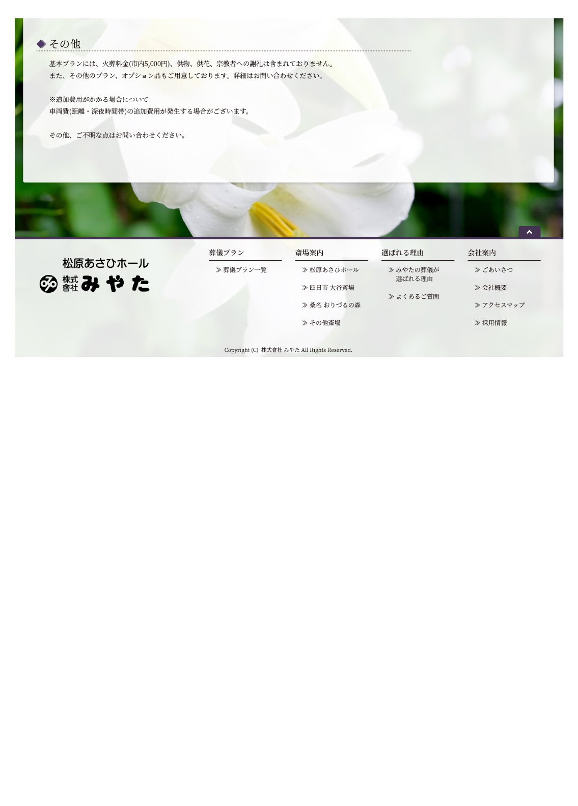 基本プランには、火葬料金(市内5,000円)、供物、供花、宗教者への謝礼は含まれておりません。