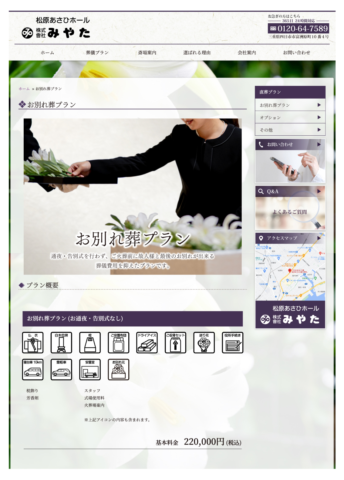 基本プランには、火葬料金(市内5,000円)、供物、供花、宗教者への謝礼は含まれておりません。