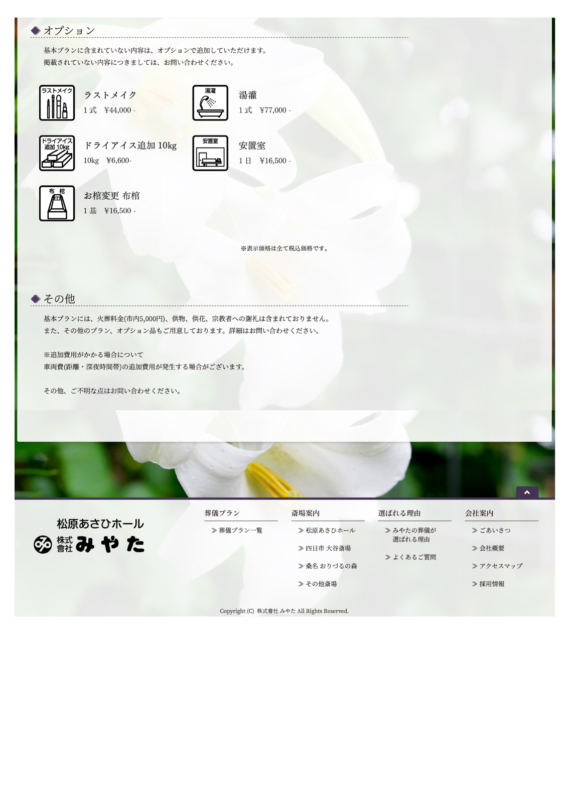また、その他のプラン、オプション品もご用意しております。詳細はお問い合わせください。