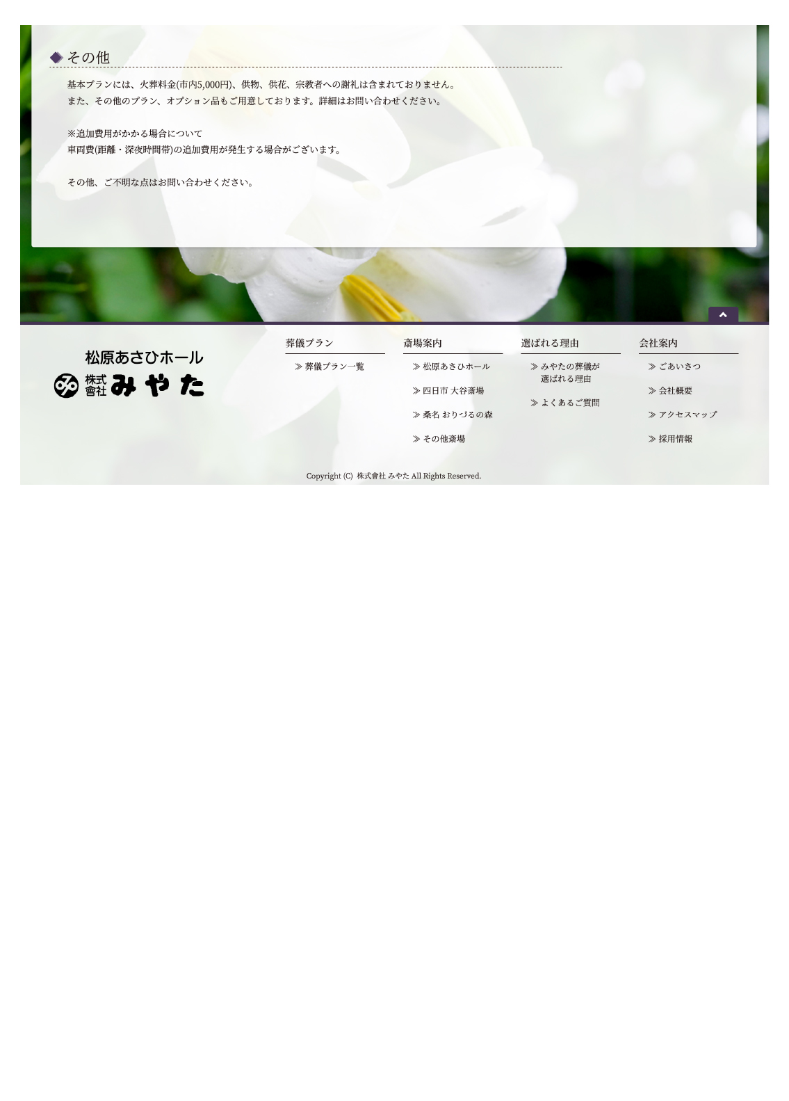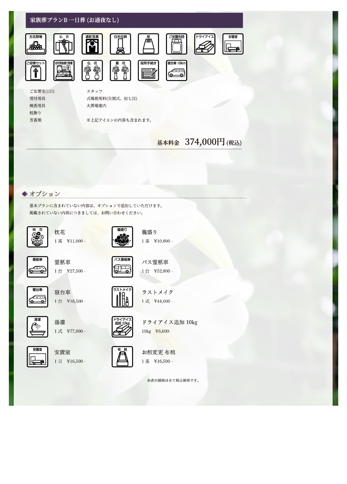 基本プランには、火葬料金(市内5,000円)、供物、供花、宗教者への謝礼は含まれておりません。