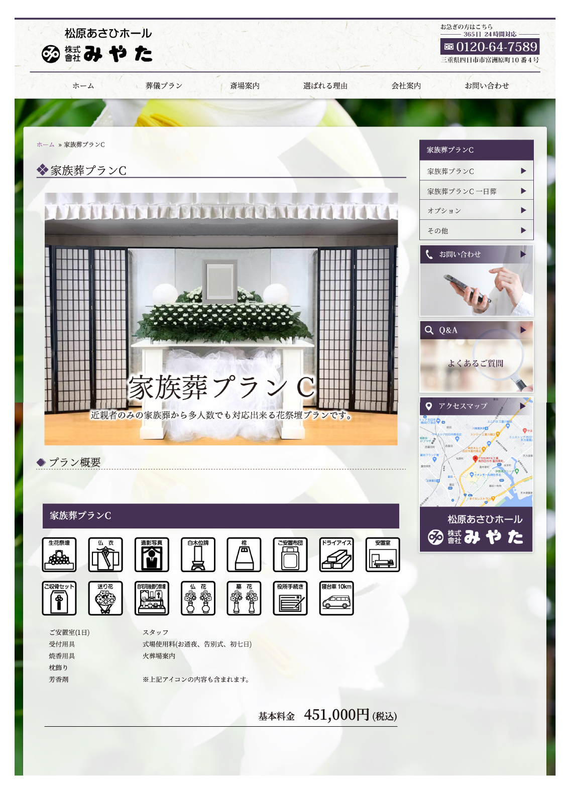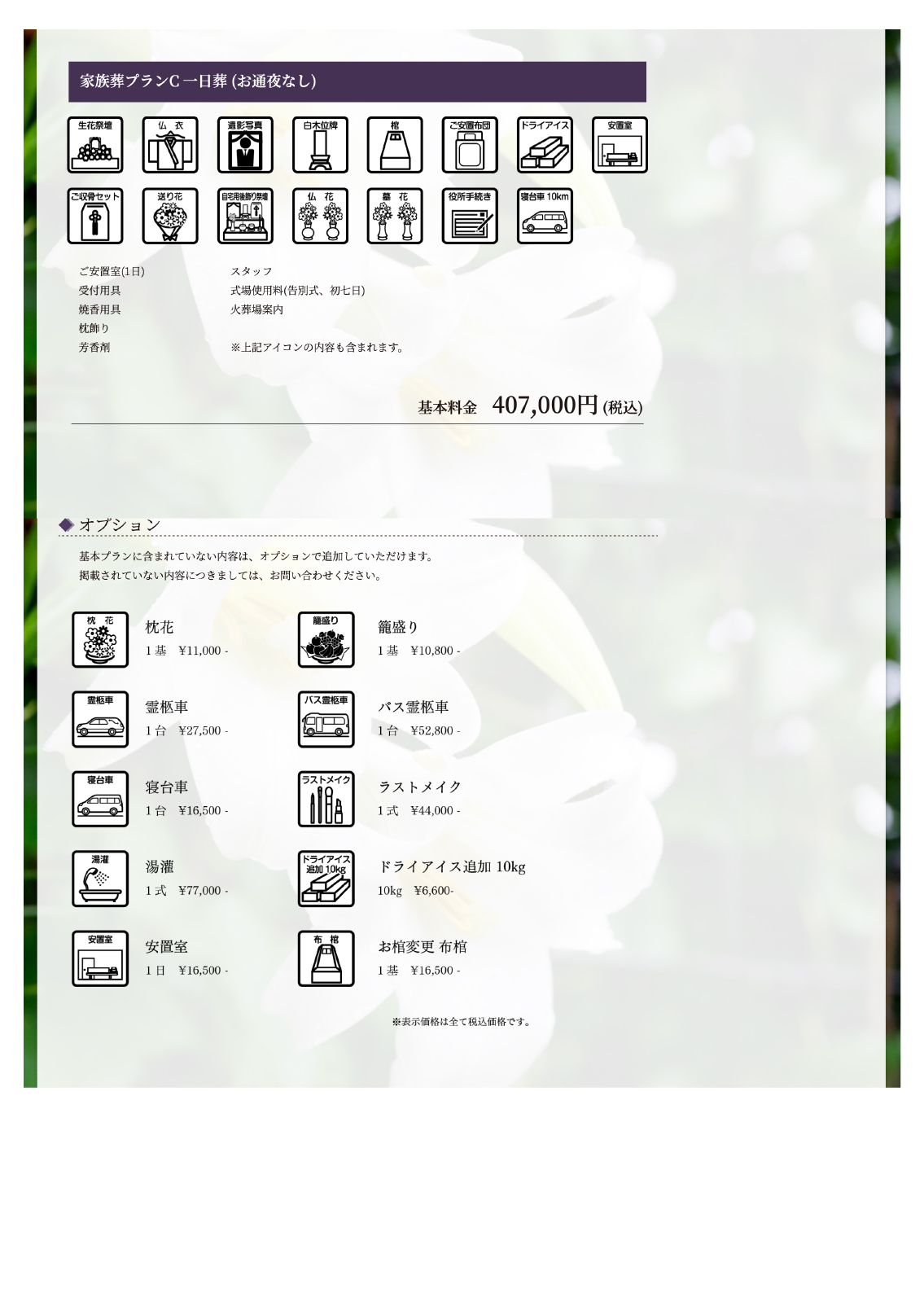 基本プランには、火葬料金(市内5,000円)、供物、供花、宗教者への謝礼は含まれておりません。