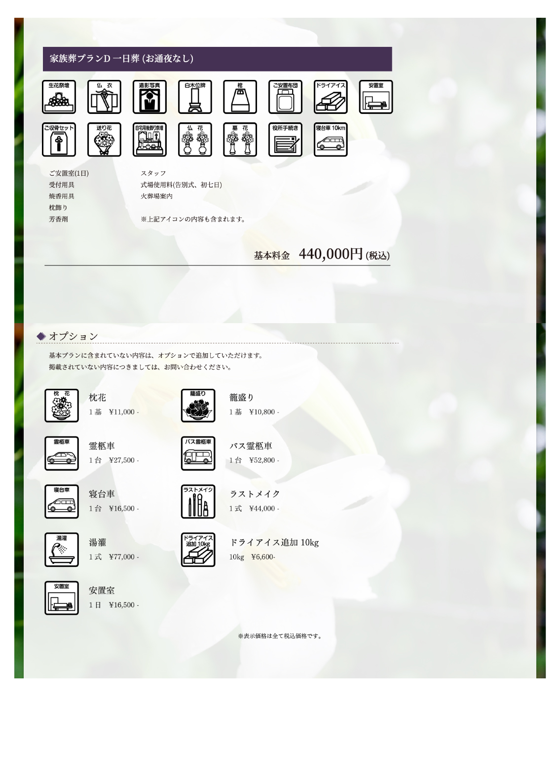 基本プランには、火葬料金(市内5,000円)、供物、供花、宗教者への謝礼は含まれておりません。