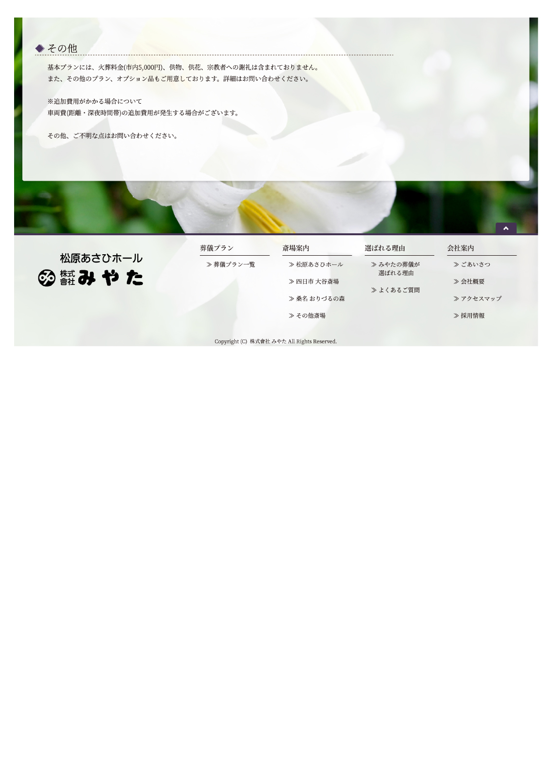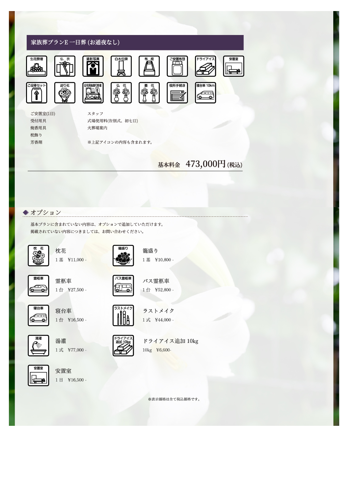 基本プランには、火葬料金(市内5,000円)、供物、供花、宗教者への謝礼は含まれておりません。